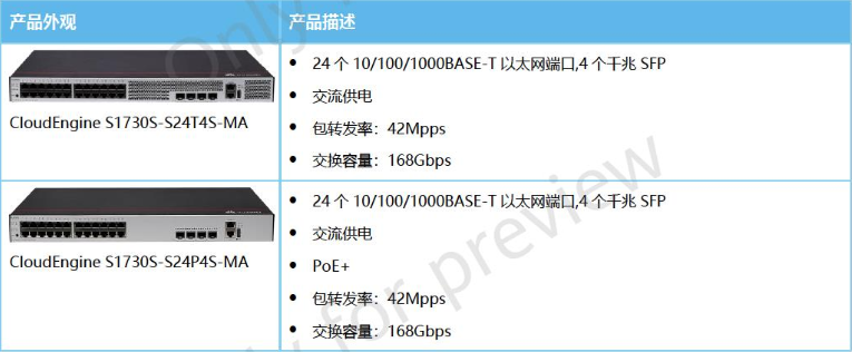 产品名称: 华为 CloudEngine S1730S视频监控交换机 S1730S-S24T4S-MA S1730S-S24P4S-MA 包含WEB管理行和无管理行