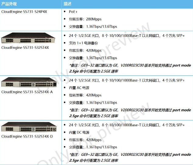 产品名称: 华为 CloudEngine S5731-S系列交换机 S5731-S24P4X S5731-S32ST4X S5731-S32ST4X-A S5731-S32ST4X-D