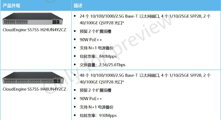 产品名称: 华为 CloudEngine S5755-H系列高品质2.5GE交换机 S5755-H24UN4Y2CZ S5755-H48UN4Y2CZ 4个25G,2个100G核心交换机