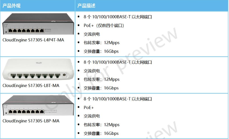 产品名称: 华为 CloudEngine S1730S视频监控交换机 S1730S-L4P4T-MA S1730S-L8T-MA S1730S-L8P-MA 包含WEB管理行和无管理行