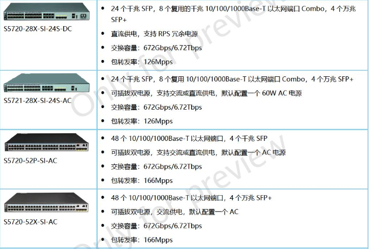 产品名称: 华为 S5720-SI系列标准型千兆以太交换机 S5720-28X-SI-24S-DC S5721-28X-SI-24S-AC S5720-52P-SI-AC S5720-52X-SI-AC 三层交换机