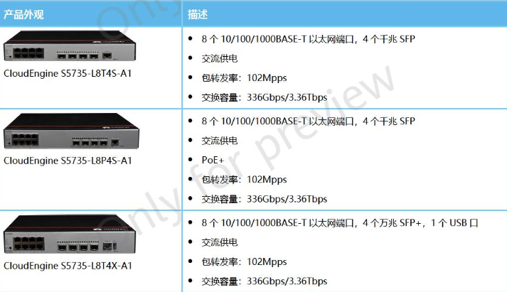 产品名称: 华为 CloudEngine S5735-L系列交换机 S5735-L8T4S-A1 S5735-L8P4S-A1 S5735-L8T4X-A1 千兆以太网交换机